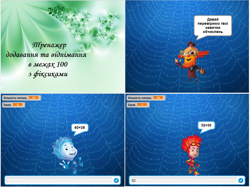 «Тренажер додавання та віднімання в межах 100 з фіксиками». Переможець ІІІ фестивалю Scrаtch-проектів у номінації «Навчаємося разом з Рудим Котом»