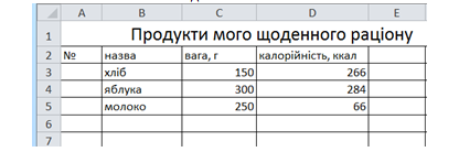 Використавши заготовку Домашнє завдання до уроку 21.xlsx створи власну таблицю «Продукти мого щоденного раціону» на аркуші Раціон, в яку введи щоденно вживані продукти харчування. Інформацію про калорійність обраних продуктів можна взяти з ресурсу http://sportivnoe-pitanie.net.ua/sportivne-harchuvannja/99-tablitsja-skladu-ta-kalorijnosti-produktiv.html.