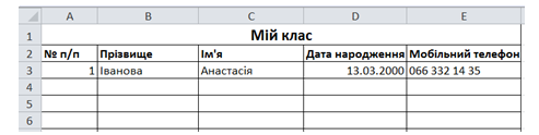 На аркуші Мій клас заповни таблицю мій клас. Введи інформацію про 7-8 учнів класу. Структуру таблиці можна доповнити.