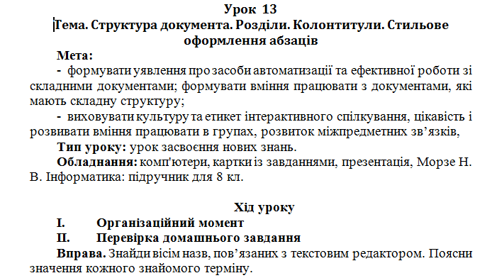 Урок 13 . Структура документа. Розділи. Колонтитули. Стильове оформлення абзаців.