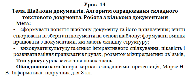Урок 14 Шаблони документів. Алгоритм опрацювання складного текстового документа. Робота з кількома документами
