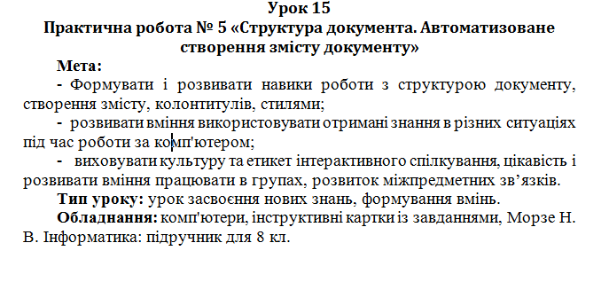 Урок 15.Практична робота № 5 «Структура документа. Автоматизоване створення змісту документу»