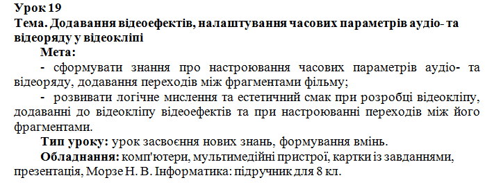 Урок 19. Додавання відеоефектів, налаштування часових параметрів аудіо- та відеоряду у відеокліпі