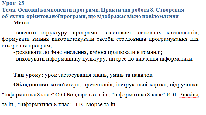 Урок 25. Основні компоненти програми. Практична робота 8. Створення об’єктно-орієнтованої програми, що відображає вікно повідомлення.