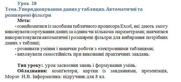 Урок 28 за підручником Бондаренка. Упорядковування даних у таблицях. Автоматичні та розширені фільтри.