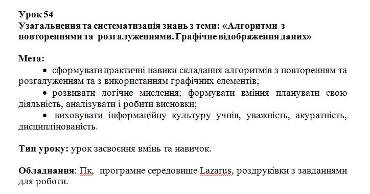 Урок 54. Узагальнення та систематизація знань з теми: «Алгоритми з повтореннями та розгалуженнями. Графічне відображення даних»