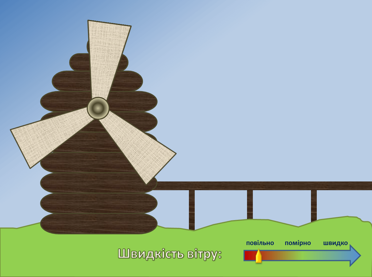 Змоделюйте зображення (за зразком рис. 1) та роботу вітряного млина. Залежно від швидкості вітру крила вітряка обертаються повільно, помірно або швидко. По небу час від часу пропливає одна або дві хмаринки. З вітряка час від часу виїжджає мішок з борошном та рухається по конвеєру за межі екрану (рис. 2).Зображення мішка міститься у файлі mishok.png в папці із завданням. Інші зображення створіть вбудованими засобами редактора презентацій.