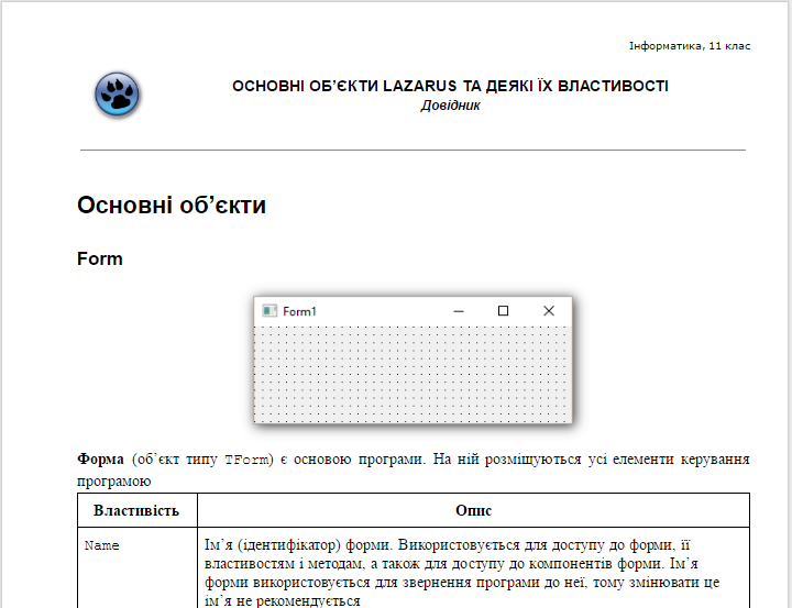 • Основні об’єкти LAZARUS та деякі їх властивості