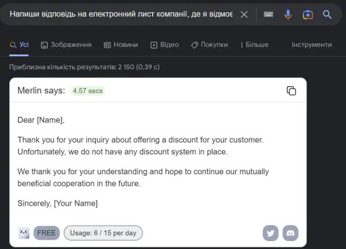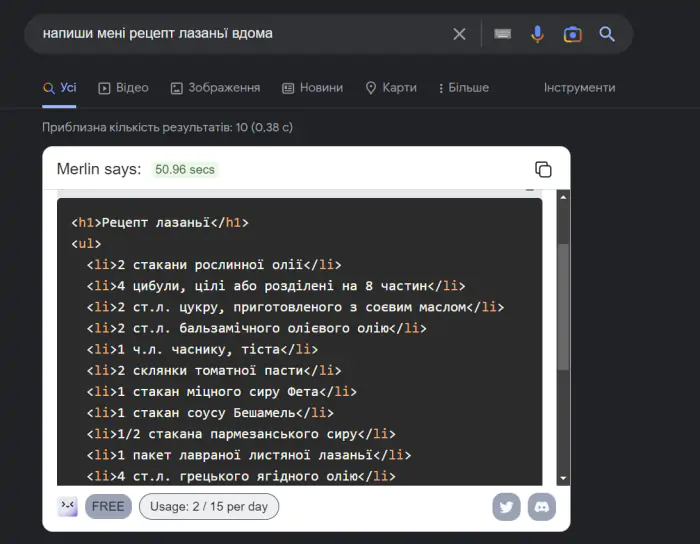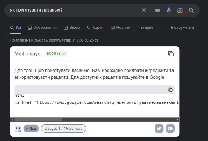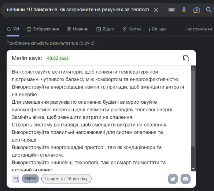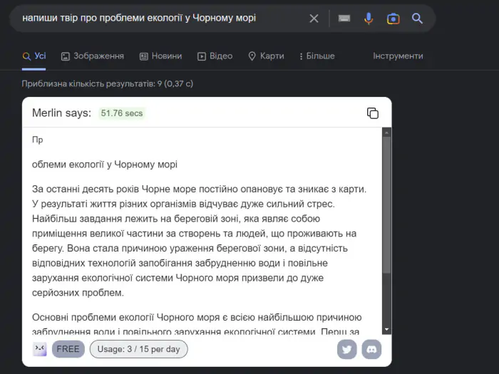 Коли ви встановили "Merlin" та зареєструвалися, відразу під рядком пошуку Google з’явиться відповідне віконце, де й генеруватимуться відповіді. Для цього треба лише натиснути кнопку Search. Сервіс може писати вашою мовою, проте добре розуміє лише англійську.