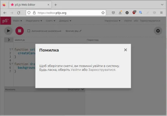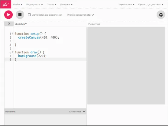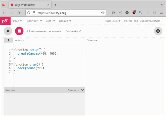Завважте, що Вам не потрібно нічого встановлювати і Ваша робота не залежить від версії операційної системи — немає різниці це Windows, Mac OS чи Linux, всі сучасні браузери(Chrome, Firefox, Edge, Safari та інші) дозволяють працювати у середовищі програмування P5.js
