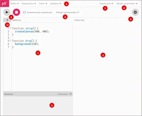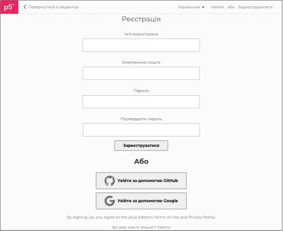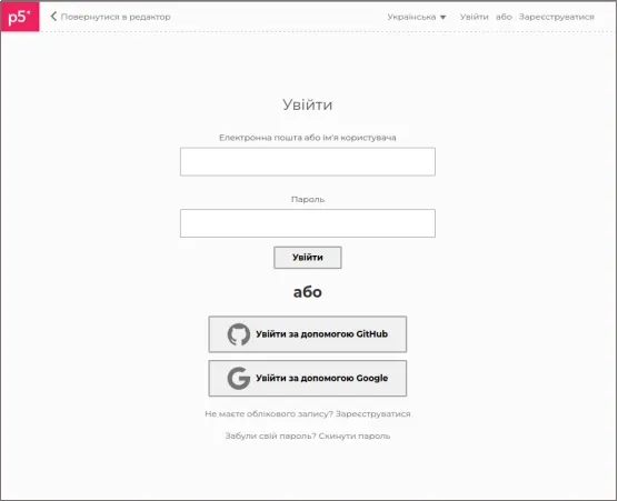 - Сторінка середовища програмування — https://editor.p5js.org/