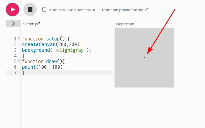 Починати малювати ми почнемо з побудови точки. На екрані точка — це еквівалент пікселя, розташованого у вікні побудови за двома координатами по осях x та y, що відповідають відповідно ширині(горизонтальній осі) та висоті(вертикальній осі) області побудови. Дотримуючись цього принципу, побудова точки в P5js здійснюється з використанням інструкції point(x,y).