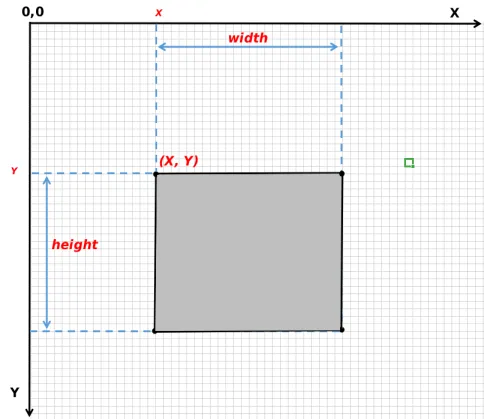Прямокутник будується за чотирма значеннями — rect(x,y,ширина,висота). Перша пара значень x і y, у режимі за замовчуванням(режим CORNER) відповідає лівому верхньому куту прямокутника, як і точка. З іншого боку, друга пара значень буде посилатися не на положення нижнього правого кута, а на ширину(на осі x, тобто по горизонталі) та на висоту(на осі y, по вертикалі) цього прямокутника.
