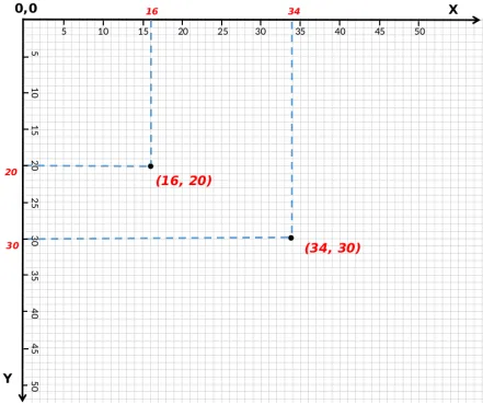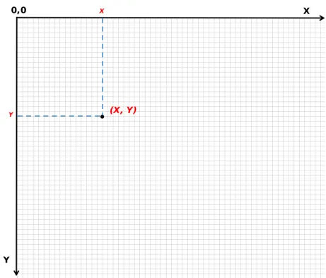 Більшість графічних побудов ми будемо проводити на площині, тобто у двохвимірній системі координат(2D), у якій положення будь-якої точки можна записати двома числами, які відповідають проекції положення точки на осі координат OX (горизонтальна вісь) та OY(вертикальна вісь). На відміну від звичайної (декартової) системи координат, зазвичай ми не матимемо від’ємних значень координат, початок відліку знаходиться у верхньому лівому куті вікна візуалізації і він має координати x = 0 та y = 0. Значення x зростають зліва праворуч, а значення y збільшуються вниз. Максимальні значення x та y обмежуються розміром вікна візуалізації, хоча насправді вони можуть бути і більшими, але об’єкти з такими координатами не відображатимуться на екрані. у саме в цьому просторі ми будемо малювати.
