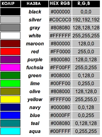 Більше: https://www.w3.org/wiki/CSS/Properties/color/keywords
