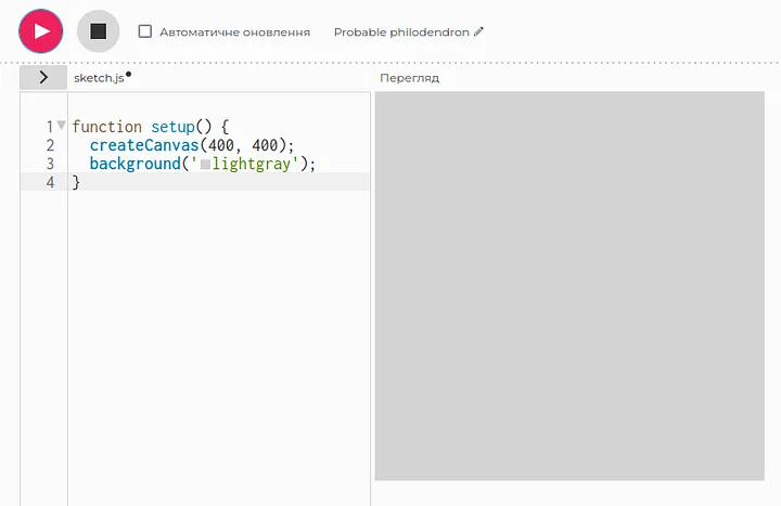 Відкрийте у вебпереглядачу сторінку редактора P5js https://editor.p5js.org/ та введіть або скопіюйте до нього поданий вище код.