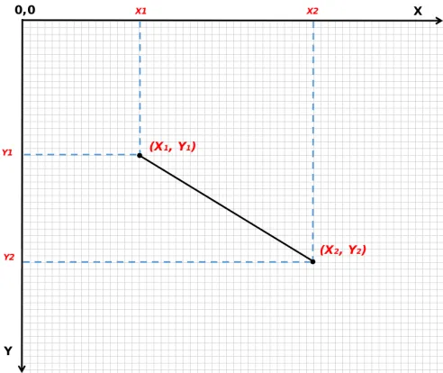 За визначенням, пряма AB складається з множини точок між початковою точкою і кінцевою точкою B. Для її побудови нам потрібні лише координати x та y точок A і B. Отже, якщо, наприклад, у вікні за замовчуванням точка A знаходиться в області внизу ліворуч вашого вікна, а точка B — вгорі праворуч, наступні інструкції можуть побудувати цей рядок як line(x1,y1,x2,y2) :
