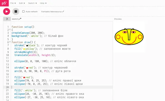 Памʼятаємо, що пропонований код ви можете копіювати та спробувати у редакторі за адресою https://editor.p5js.org/